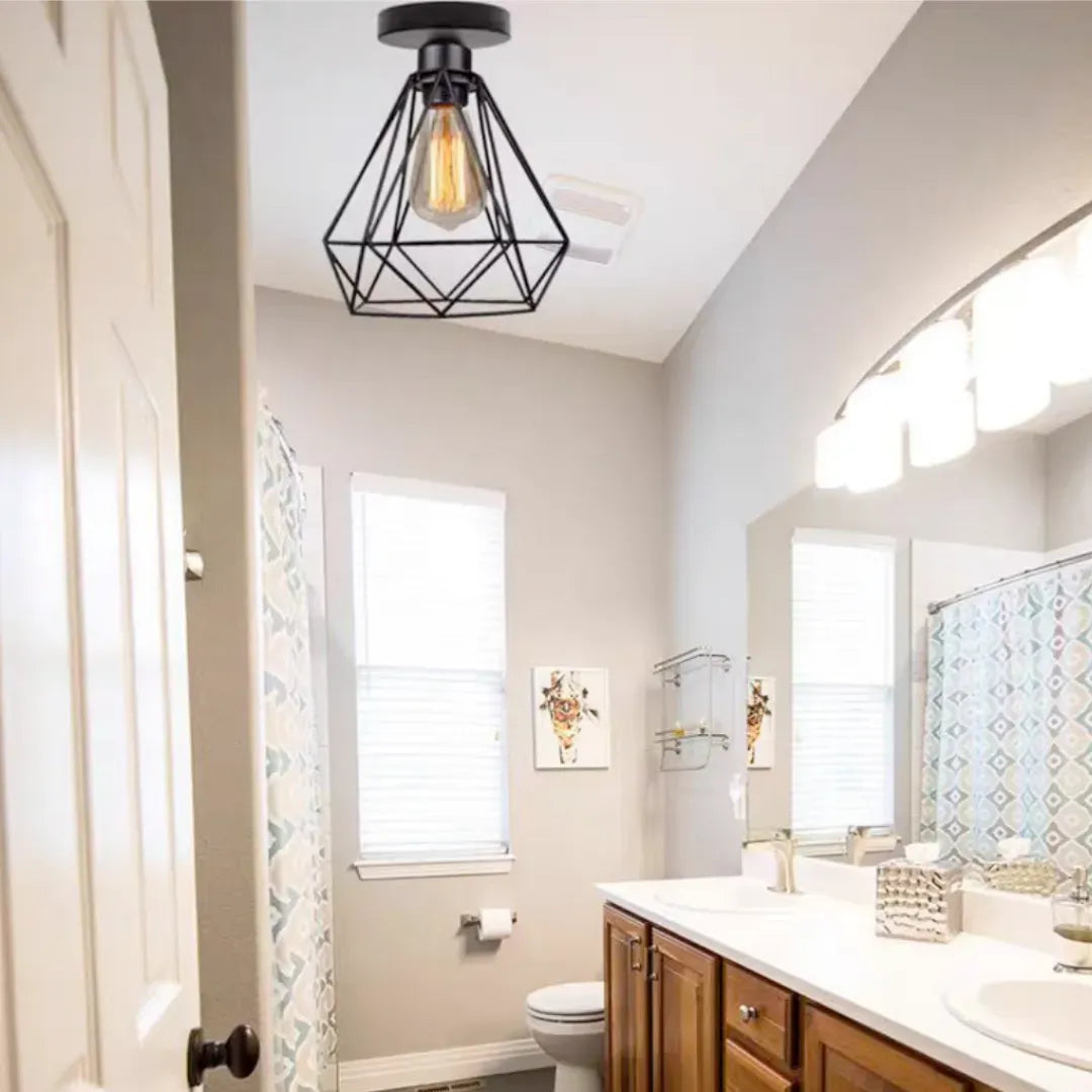 Structura metalica in finisaj negru mat si forma geometrica clara o fac usor de integrat in amenajari simple, industriale sau minimaliste. Dimensiunile reduse (⌀20 cm, inaltime 24 cm) permit montajul in zone cu tavan standard sau jos.