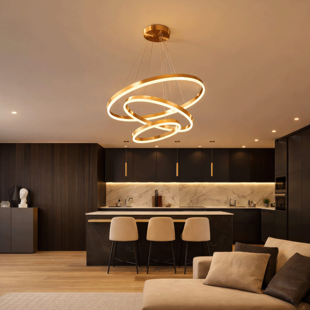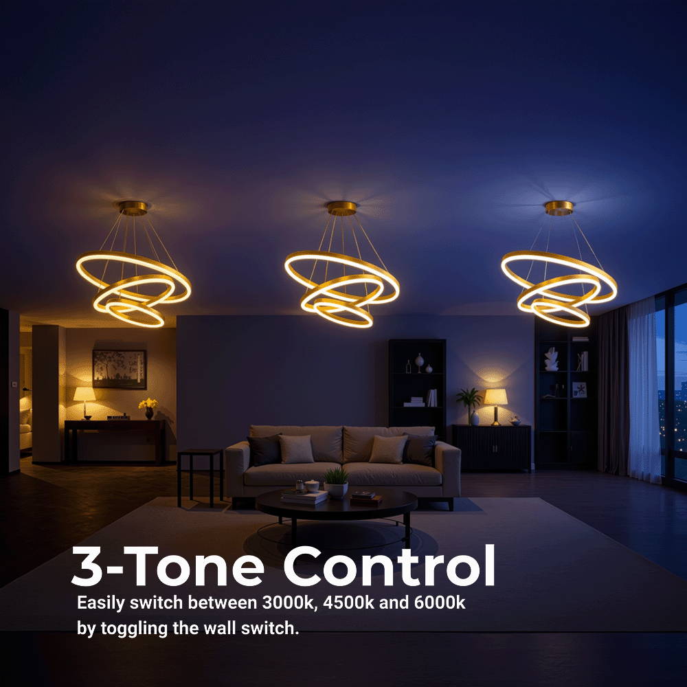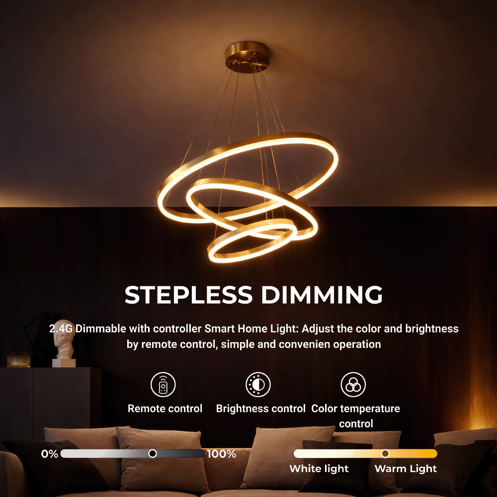 Lustra LED suspendata cu telecomanda ELIZABETH, 85W, 3 Cercuri, lumina Rece/Calda/Neutra, Dimabila, Auriu Lucios, Inaltime Reglabila
