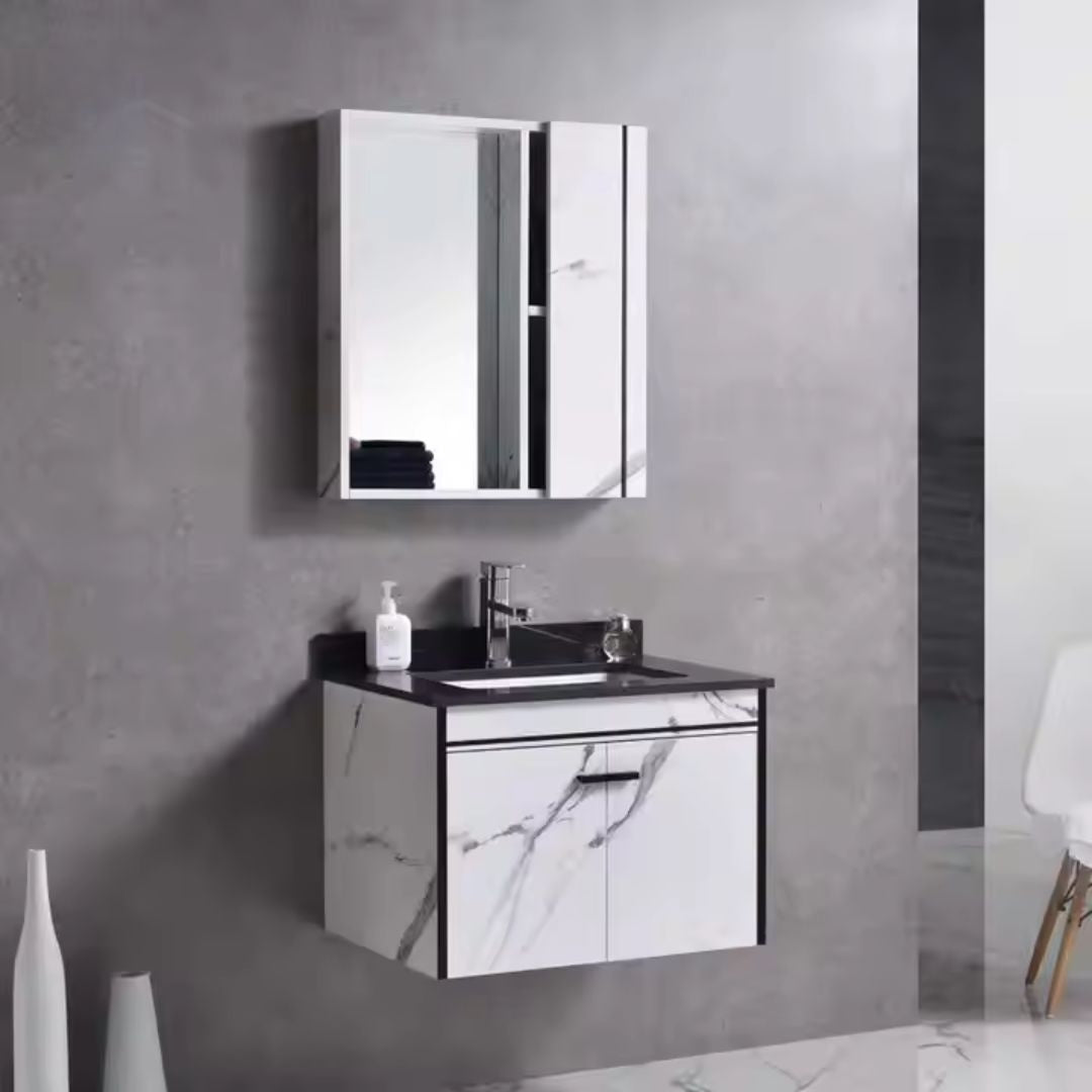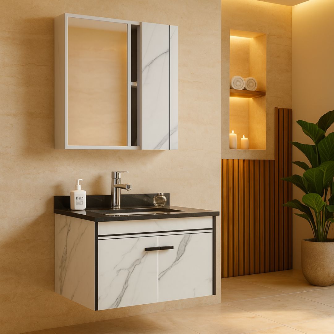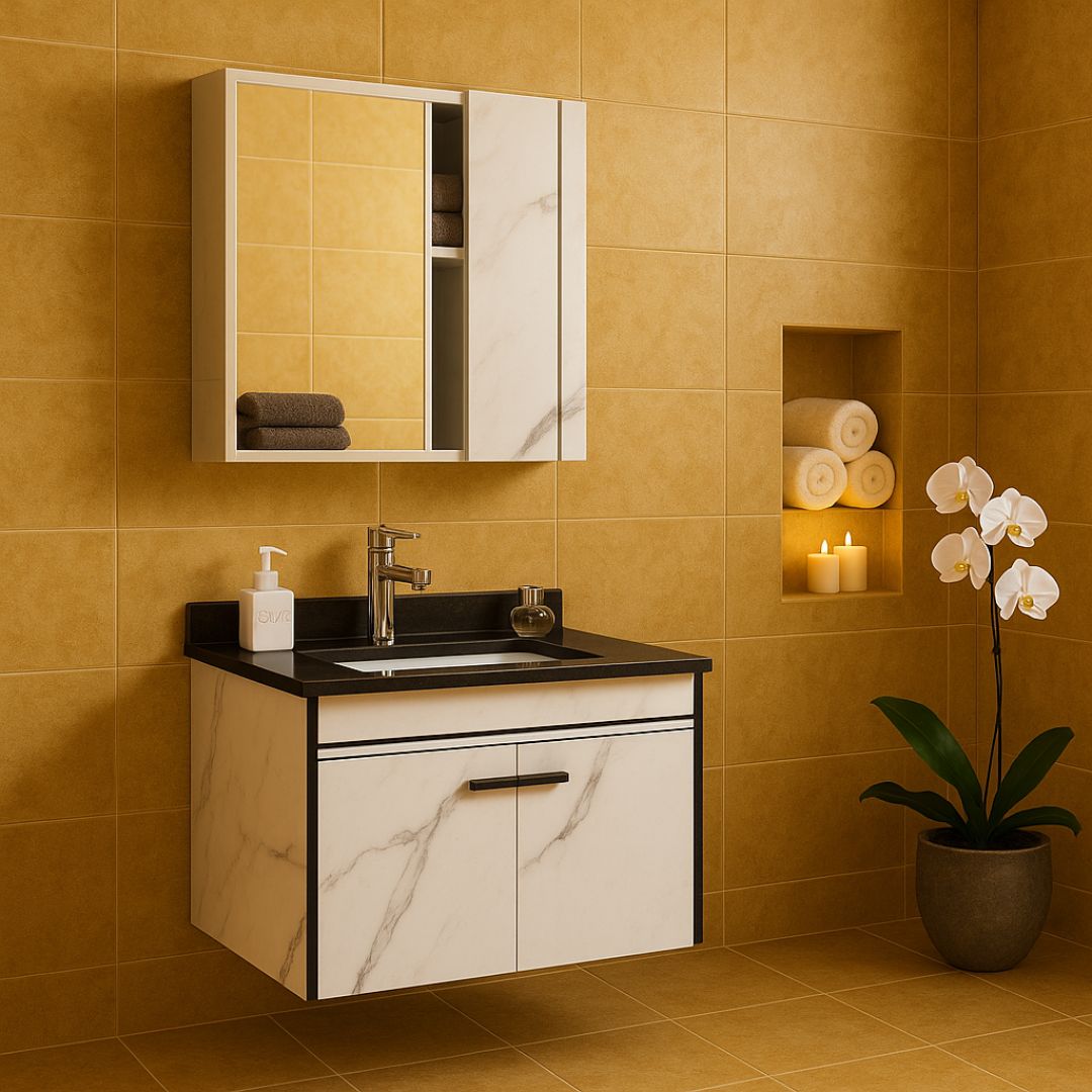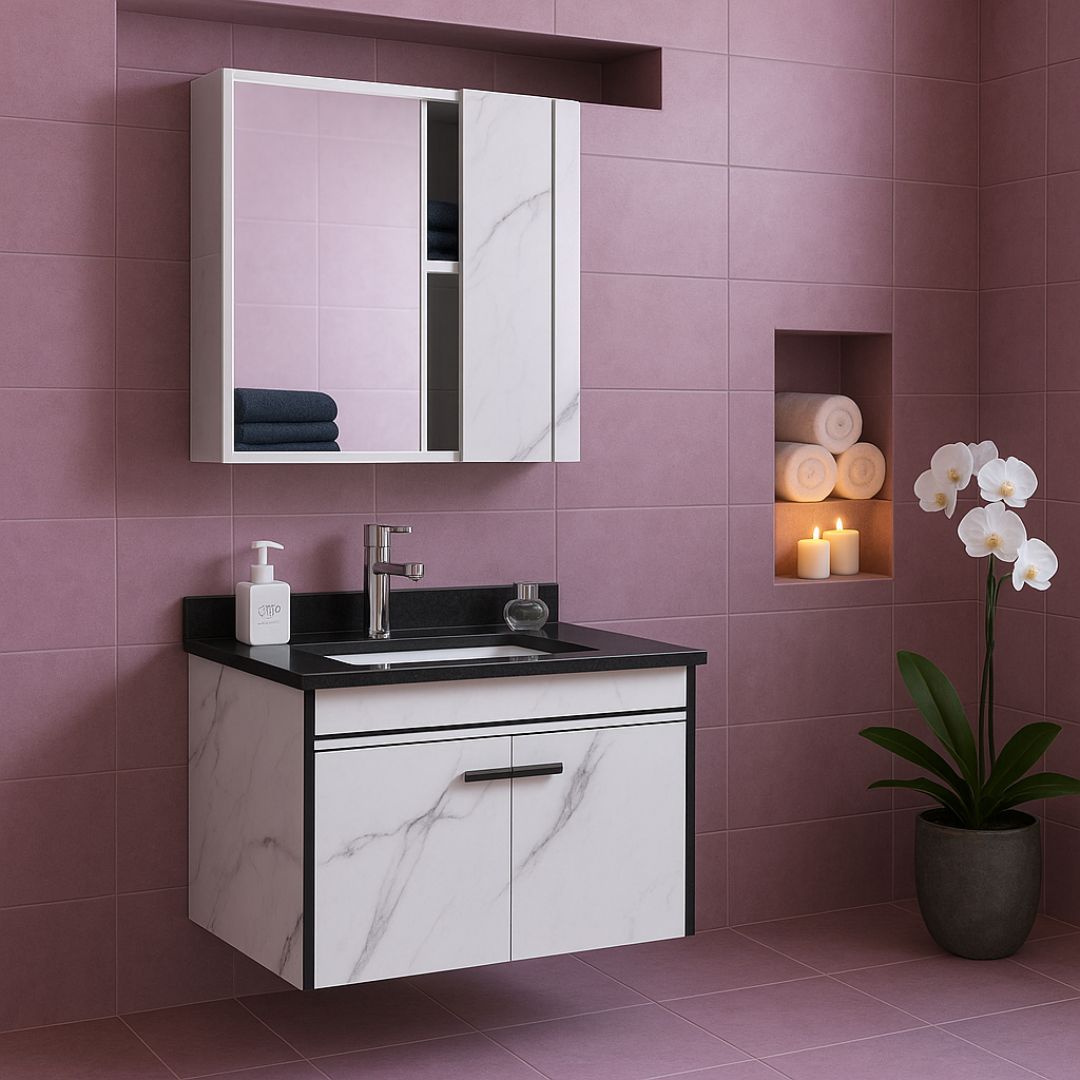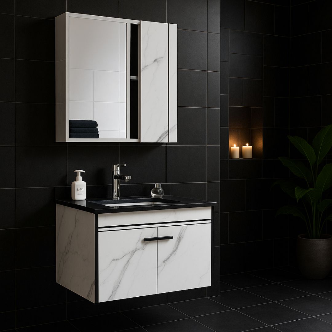 Functionalitatea defineste fiecare detaliu. Datorita designului suspendat, curatarea podelei devine o sarcina simpla si rapida, fara obstacole. Spatiile de depozitare sunt gandite pentru o viata reala: un cabinet inferior pentru prosoape si alte produse voluminoase, si unul superior, cu zona deschisa pentru acces imediat la esentiale. Totul sta ascuns, pentru o baie mereu ordonata. Finisajul cu aspect de marmura aduce eleganta fara efortul de intretinere specific pietrei naturale, in timp ce blatul negru mascheaza eficient urmele de apa.